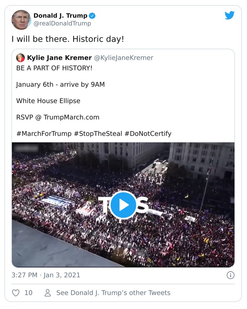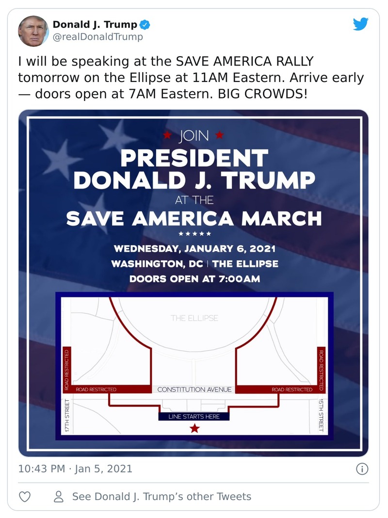 Despite being full of falsehood, denunciation of the election result, and self praise (he “had to beat Oprah, [who] used to be a friend of mine”), the speech does not seems to be a direct incitement to riot. There is little to no evidence for his impeachment on those grounds here [although see this analysis, which I think its a bit strained]. Indeed Trump said:
