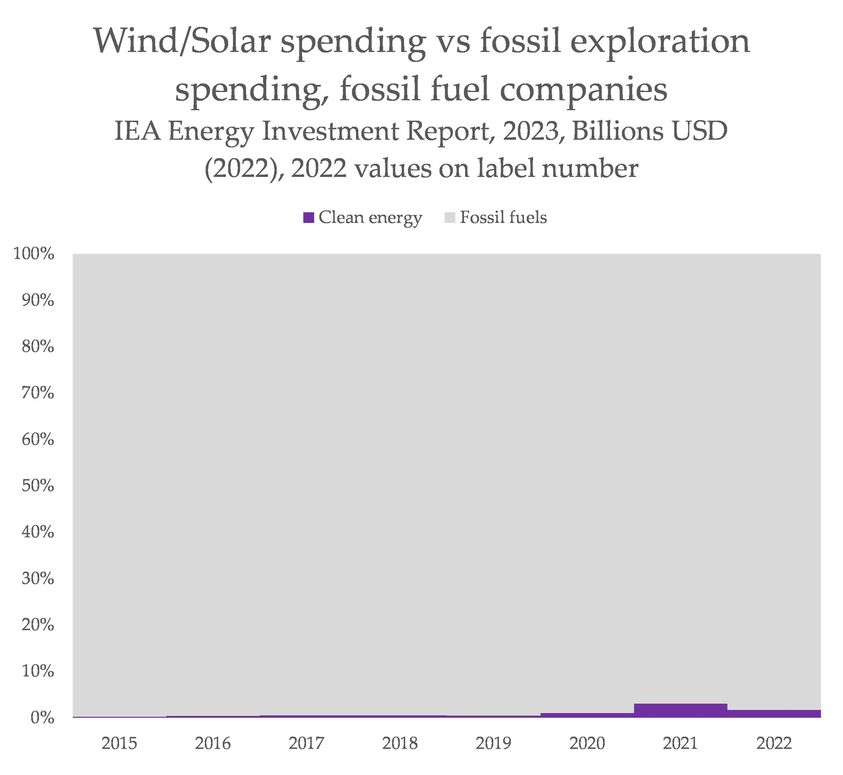 Climate tech, without regulation may do little. For example renewables can be used to increase the energy supply cheaply, without decreasing the amount of fossil fuels that are used. This seems to be standard in many places, and it is standard in fossil fuel company spending – in which spending on exploration and new fossil fuels is at least 15 to 20 times higher than their spending on renewable development, as shown in this graph, The grey area represents expenditure on exploration for fossil fuels.